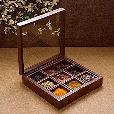 Wooden handcrafted Multipurpose Spice box with nine partitions and spoon