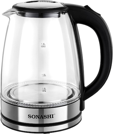 Stylish Kitchen Essentials: Sonashi 1.8l Kettle combines modern features with timeless elegance. It is an efficient kitchen tool allowing you to boil water, make tea or soups within minutes. Cordless Portable Kettle: This modern electric kettle has a cordless design which means you can detach the water kettle from its 360-degree swivel base and carry it for easy pouring. The single push start/stop button makes it easy to use. Solid Construction: This cordless electric kettle has a glass body. It has an inner core made with stainless steel to keep the content hot for long. It has a 1550W power motor with a concealed heating element that helps boil 1.8l of water within minutes. Safety Features: The advanced kitchen kettle is equipped with a boil-dry protection mechanism that shuts off the power supply when the water tank is empty or dries out during use. Its red power on/off indicator helps avoid overheating. Product Specification: Sonashi 1.8L glass water kettle comes with a safety locking lid for security and works on a low power requirement of 220-240V and 50/60Hz.