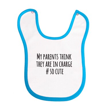 - Soft baby bib, white with blue trim, 100% cotton machine washable. Age: 6-12 months. Print: My Parents Think They Are In Charge #socute.