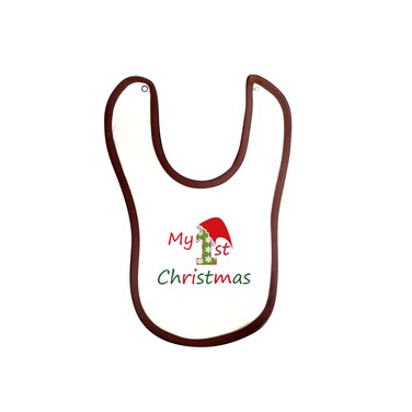- Soft baby bib, white with brown trim, 100% cotton machine washable.Age: 6-12 months. Print: My 1st Christmas.