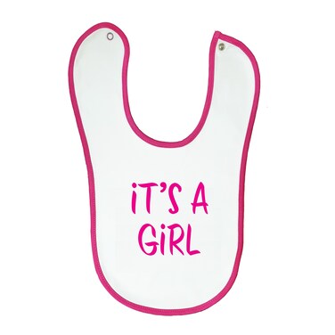Cheeky Micky -Soft baby bib, white with pink trim, 100% cotton machine washable. Age: 6-12 months. Print: It's A Girl.