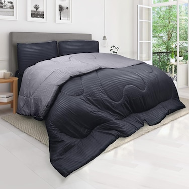 Hotel Linen Klub Reversible Down Alternative Comforter Set, Ultra Soft Brushed Stripe Microfiber Fabric, 200GSM Soft Fibersheet Filling, Size: King 240 x 260cm, Charcoal & Lt. Grey