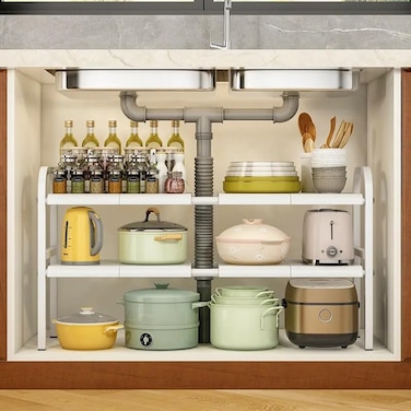 - 【Durable】: The under sink organizer is made of high quality PP material and carbon steel material, which is double waterproof, rustproof and corrosion resistant, very strong and durable. Our multi-functional under sink organizer can be installed under the sink with water pipes running through it, so don't worry about it taking up too much space! 【Size specification】: The length of the expandable under-sink cabinet organizer can be stretched from 53~88CM, which is suitable for various sizes of cabinets. Please measure and know the size you need for your space before purchasing 【Adjustable Design】 The length of this 2 tier expandable under sink shelf can be easily adjusted using the expandable steel rod. The length of the shelf is free to expand and retract, suitable for cabinet storage , desktop storage, cabinet storage, under sink storage, bathroom storage . 【Removable plastic plate】: The upper layer under the sink can be disassembled and moved at will, and most of the lower sink plumbing design can be installed and used 【Easy to Assemble】: The shelf has a classic and stylish design, easy to assemble and use, this kitchen sink shelf comes with instructions and accessories, just install it in minutes.