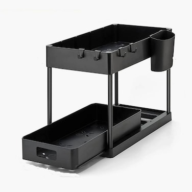 This organiser is designed to fit underneath the sink and can be adjusted to fit the width and height of your cabinet. It is an effective way to use the often overlooked space under your sink by creating a storage area for various items that is easily accessible and organised. The installation is quick and easy, and it won't damage your cabinet. Simply place four tubes in the bottom drawer and connect them to the top shelf. It includes four removable hooks and a hanging cup for storing additional tools and small items. The convenient height of the edge prevents items from falling. It has four support steel tubes with a rust-proof coating, good load-bearing capacity, and is not easy to shake. The two-tier baskets have a hollow design for good drainage, with no water accumulation.