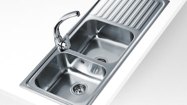 • Inset Sink, Two bowls and One drainer 3½ Manual basket waste with Overflow and Siphon 80 cm base unit