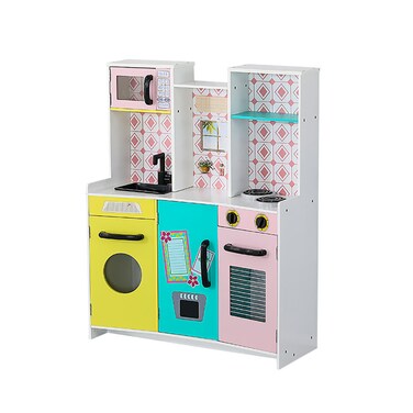 A classic kids playset gets a super realistic upgrade in the Wooden Play Kitchen. this educational setup features every essential appliance found in a real modern kitchen, so kids can pretend to cook, clean, and maintain a household.Just like mom and dad.