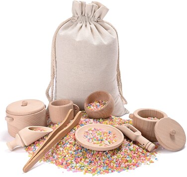 Perfect Gift for Kids——Each pack includes an eco-friendly drawstring bag and 8pcs wooden items. It is a perfect wooden toy gift for toddlers. Please note the bin and material showed in the pictures are not included.