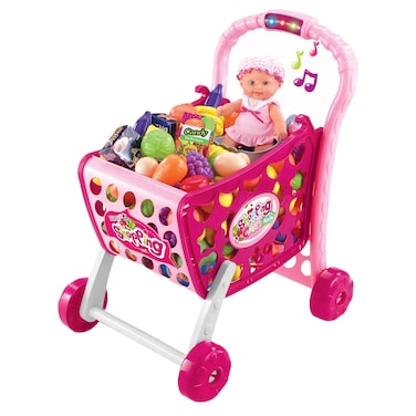 It features a shopping cart that can be used to push and carry items, a mini supermarket playset with shelves and accessories, and a detachable carrying case for easy storage. The cart is designed with bright and vibrant colours, making it visually appealing for children.