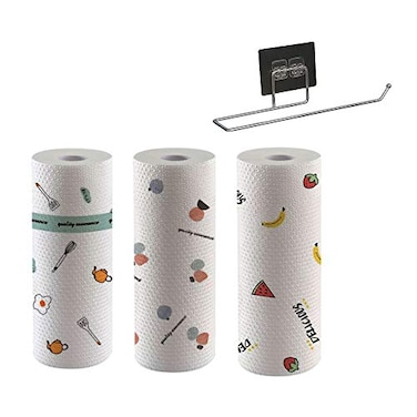 3 Rolls Disposable Cleaning Towel with Wall-mount Holder Cartoon Printed Kitchen Dish Cleaning Towel Reusable Non-Woven Fabric Dish Cloth 9.84 * 9.84in