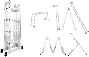 Ideal for home improvement and renovation projects. Great for professional contractors and handymen. Perfect for cleaning gutters, windows, and walls. A must-have for painting and decorating tasks. Excellent for reaching high shelves or storage areas. Suitable for tree trimming and outdoor maintenance. Convenient for changing light fixtures and bulbs. Handy for installing curtains, fans, and other fixtures. Versatile for both residential and commercial use. Introducing our Multipurpose Aluminium Ladder with 16 steps, designed to be your go-to tool for a wide range of tasks. Crafted from high-quality aluminum alloy, this ladder is lightweight, durable, and corrosion-resistant. Its versatile design allows you to configure it as an A-frame, straight ladder, or stairway ladder, making it suitable for both indoor and outdoor applications. Safety is a top priority with anti-slip rungs and non-slip feet, ensuring stability while you work. With 16 steps, this ladder extends up to 4.7 meters, providing you with easy access to high places for various tasks like painting, cleaning, maintenance, and DIY projects. The ladder's compact design allows for convenient storage and transportation, saving you valuable space in your workspace or at home. Easy to adjust, fold, and unfold, this ladder is user-friendly for both professionals and DIY enthusiasts. Make your tasks easier and safer with our Multipurpose Aluminium Ladder, the perfect solution for reaching new heights.