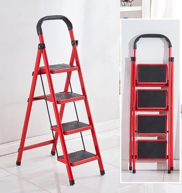Rubik Ladder Foldable 4 Steps, Wide Step Steel Multi Purpose Portable Folding Stepladder Stool for Home Kitchen Garden Office Warehouse (Red)