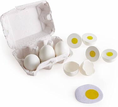 Hape Egg Carton, 3 Hard-Boiled Eggs With Easy-Peel Shell & 3 Fried, Wooden Realistic Educational Toy For Children 3+, White And Yellow (E3156)