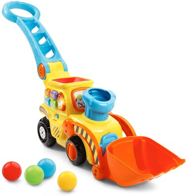 Pop, drop and watch your little one stroll along with the pop-a-balls push & pop bulldozer by VTech! This delightful bulldozer encourages movement and motor skills in your little Builder when the colorful balls pop up through the chimney, into the scoop bucket and back again. Load the balls into the bulldozer, start pushing the chunky handle and the watch the bulldozer come to life with Poppin' Balls and fun tunes! Your little one can also sit and play with the bulldozer by pressing the buttons to learn colors, numbers and music.