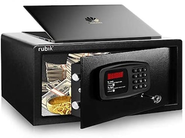 - Secure your laptops, tablets and other electronics with the Large Electronic Digital Safe by Rubik. The interior of this Rubik is large enough to store a standard sized laptop, tablet PC or document folder, safeguarding your electronics and personal information from theft, misuse or destruction. The keypad is powered by the (included) 4-AA batteries, can be programmed to accept a 3 to 8-digit pin code, and can be bypassed with the included override key in emergency situations. The safe is best size for to store under a bed or in a closet, making it great for college students to store their laptop or tablet, important paperwork and extra cash safely in their dorm or campus apartment. This lock box great for securing valuables even while traveling. Reprogrammable digital access; uses four AA batteries (included), Comes with 1 override key. (no spare keys available) SIZE: L42xW37xH20cm WEIGHT: 11KG This Rubik security safe with electronic lock and emergency override key, Carpeted floor to protect against scratches and damage