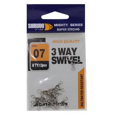 The Shirudo Mighty Series 3-Way Swivel Size 07 in Silver is a top-of-the-line fishing accessory that is built to last. With a pack of 12 swivels, you'll have plenty to tackle any fishing situation that comes your way.
