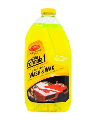 - Formula 1 Wash & Wax 64Oz is a genuine and rich foam-based solution that helps you in deep cleaning bugs, dirt, tar and road grime from the surface of your automobile. It contains superior quality Brazilian Carnauba Wax that will leave water-beading protection to all paint finishes and will last for up to 12 months. It is easy to apply and rinse off without leaving water spots behind. This blend won't harm or dull the car paint.