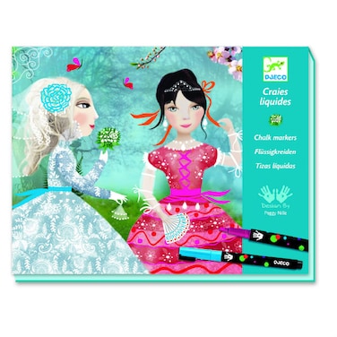 Djeco Chalk Markers Ribbons and Lace is a beautifully illustrated, fun colour by numbers art set that uses liquid chalk pens to complete the four pictures of beautiful girls in all their finery.
