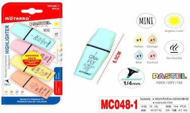 Motarro MC048-1 highlighter pen is great for highlighting important text content, writing and remembering information. It is made with soft chisel tips for smooth writing without paper breakage. It comes with wide barrel and large ink supply that delivers dependable highlighting. Suitable for school, college, home, office, even travel diary. Quick-drying ink resists smearing.