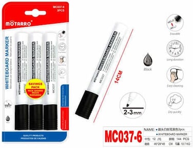 • <p><bi>Brand:Motarro <p><bi>Item Name: Whiteboard Marker <p><bi>Model No: ‎MC037-6 <p><bi>Product Dimensions ‎21 x 4.6 x 12.3 cm; 210 g <p><bi>Number of Items 3 <p><bi>Colour Black