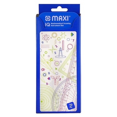 The Maxi IQ Mathematical Drawing instrument Box is a set of 10 multi-coloured drawing instruments.