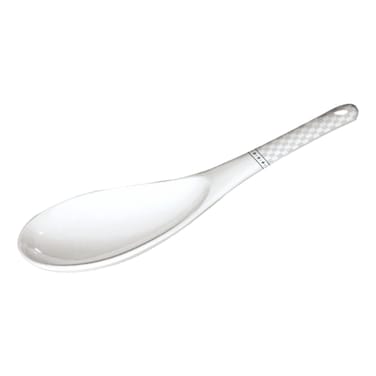It features a sleek white design with a checkered pattern on the handle, adding a touch of elegance to your table setting. The spoon is made of high-quality plastic, making it durable and easy to clean.