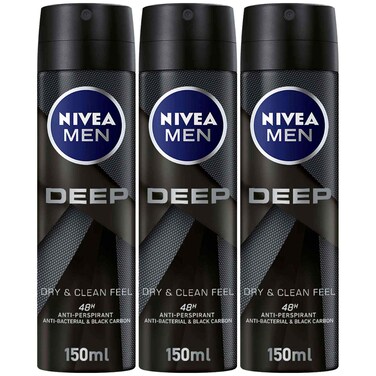 NIVEA MEN Antiperspirant Spray for Men DEEP Black Carbon 150ml Pack of 3
