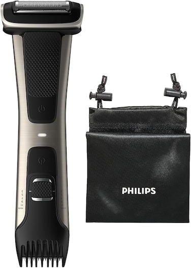 Philips bodygroom series 7000 showerproof body groomer bg7025/13 features unique dual sided design that let's you switch between shaving & trimming. The shaver adapts to the contours of your body for a smooth shave. The trimmer has 5 different lengths for trimming anywhere on your body. Showerproof bodygroomer. Cleaning brush. Storage pouch. User manual.