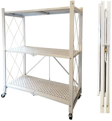 3-Tier Foldable Storage Shelves, Stand Folding Metal Shelf with Caster Wheels for Garage Kitchen Home Closet Office, No Assembly Needed - White
