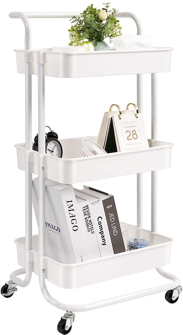 - This 3 Tier rolling shelves metal cart organizer is a multipurpose utility cart that can be used as a storage cart in the office, kitchen, bedroom, bathroom, it features four omnidirectional caster wheels and a removable handle for added convenience .