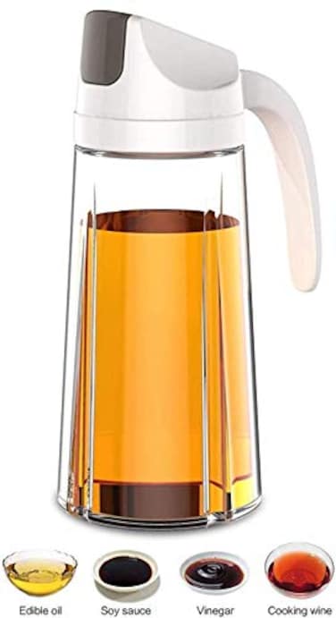 AIWANTO Oil Dispenser Bottle, Glass Vinegar Dispensing Cruets, 630ml Leakproof Condiment Container with Automatic Cap and Stopper, Non-Drip Spout, Non-Slip Handle for Kitchen Cooking