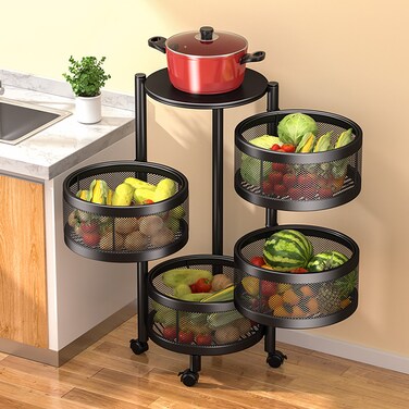 - 1.LARGE CAPACITY - high: 75cm , maximum diameter: 34cm, 4 Tier. Electrical appliances, seasoning jars, toiletries, etc. can be placed on the top layer. The four hollow baskets at the bottom can store fruits, vegetables and tableware, etc. 2.MULTIP FUNCTION - The height of each basket is 15 cm, which can make items difficult to tilt. Each basket can be rotated to facilitate storage and taking of items. The bottom of each basket is an integrally formed carved pattern, which is beautiful and functional. Compared with the ordinary strip-shaped bottom carved design, it can better hold small objects and is more stable. 3.WITH WHEELS - The wheels of storage shelf rack can rotate 360 degrees, and there are brakes on the wheels for stable parking. The movable design can bring you great convenience during use. 4.BEST PAINT and NO NEED TO INSTALL - The entire storage rack organizer with quality and environmentally friendly paint, which is not easy to rust even if it is placed in a humid environment for a long time. Therefore, you can safely put the storage shelf in the bathroom or any other place. Then, no need to install, just buy and use. 5.BEST SERVICE - We provide quality service. If you have any questions about our products, you can contact us. We will reply within 24 hours. Use the standing shelf, it can help you reduce storage time and troubles, and increase your happiness in life!