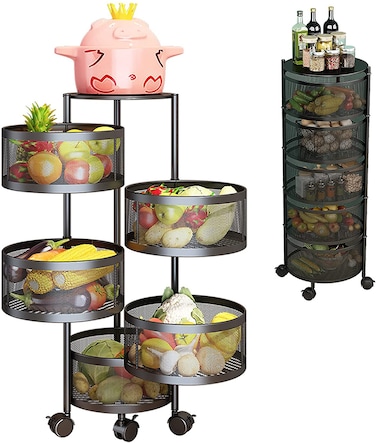 Botabay Round Rotating Multi-Layer Kitchen Storage Shelf, 5 Tier Fruit Vegetable Storage Basket, Kitchen Storage Rack Floor Standing
