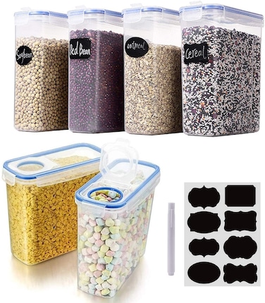 Cereal & Dry Food Storage Containers, Airtight Plastic Kitchen Storage Organizer, Set of 6 , 2.5L for Sugar, Flour, Snack, Baking Supplies, Stackable Boxes with Locking Lids with marker and stickers