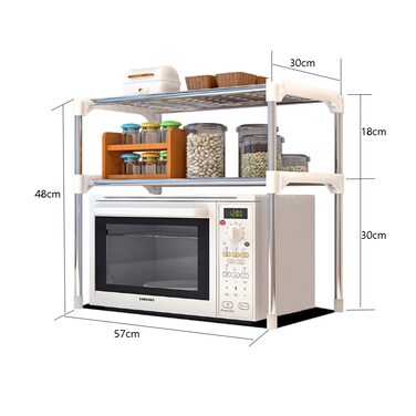 - 1. Made of steel, It is strong enough to store a microwave and other kitchen items such as tableware, spices, canned foods, condiments, bottles, dishes, pots, and pans.