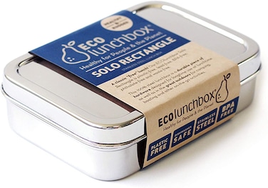 The ECOlunchbox Solo Rectangle has the largest single-compartment of all our stainless steel bento box food containers. This 100% steel lunchbox is a durable piece of hardware designed for longtime use at lunchtime as well as in the great outdoors for camping, boating, picnicking, and other on-the-go activities. Product Details: Stainless steel rectangular container with lid Container measures 4.75" wide x 6.75" long x 2" tall Contains 29 oz (3.6 cups) Tare Weight: 8 oz Great for portion control & mindful eating Non-toxic: free of estrogen-mimicking toxins commonly found in plastic, such as BPA (bisphenol-A), BPS (bisphenol-S) and phthalates Stainless Steel 201 Dishwasher safe Not for use in the microwave. Food may be reheated in the metal containers in a medium-heat oven or over a campstove. Try out our pot gripper for easy handling. Not leak proof Made in India