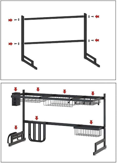 - <p>MATERIAL&SIZE: Using advanced 304 stainless steel material ensure long lasting durability, easy to clean and no rusting. Comes with step-by-step assembly instruction paper and all accessories are carefully packed. Shelf size: 34.65"L x 12.5"W x 20.4"H. (Inside size: 33.6"L x 12.5"W x 20.4"H), fits for all sinks equal or smaller than 33 1/2 inches. Please DO carefully measure the size of your sink before making a choice.<p>KITCHEN SPACE SAVER: Use this dish drying rack over the sink or on the counter, save tons of space and time by making it easier to access utensils and supplies, water will drop into the sink directly, make your kitchen more clean and tidy.<p>YOUR DISH RACK: With 7 removable individual holders that be placed at your choosing. 1× dish rack, 1× bowl rack, 1× knife holder, 1× fruit & vegetable basket, 1×chopping board/pot cover holder, 1× square basket/detergent holder, 1×cutlery holder, 5×hooks. All these parts could be adjustable and removable according to your preference.<p>EASY TO ASSEMBLE: Needed Screws & a Allen Key are included in the accessories package. No need for additional install tools. And installation manual included. It's easy for everybody to install it without any worries.<p>MATERIAL&SIZE: Using advanced 304 stainless steel material ensure long lasting durability, easy to clean and no rusting. Comes with step-by-step assembly instruction paper and all accessories are carefully packed. Shelf size: 34.65"L x 12.5"W x 20.4"H. (Inside size: 33.6"L x 12.5"W x 20.4"H), fits for all sinks equal or smaller than 33 1/2 inches. Please DO carefully measure the size of your sink before making a choice.<p>KITCHEN SPACE SAVER: Use this dish drying rack over the sink or on the counter, save tons of space and time by making it easier to access utensils and supplies, water will drop into the sink directly, make your kitchen more clean and tidy.<p>YOUR DISH RACK: With 7 removable individual holders that be placed at your choosing. 1× dish rack, 1× bowl rack, 1× knife holder, 1× fruit & vegetable basket, 1×chopping board/pot cover holder, 1× square basket/detergent holder, 1×cutlery holder, 5×hooks. All these parts could be adjustable and removable according to your preference.<p>EASY TO ASSEMBLE: Needed Screws & a Allen Key are included in the accessories package. No need for additional install tools. And installation manual included. It's easy for everybody to install it without any worries.