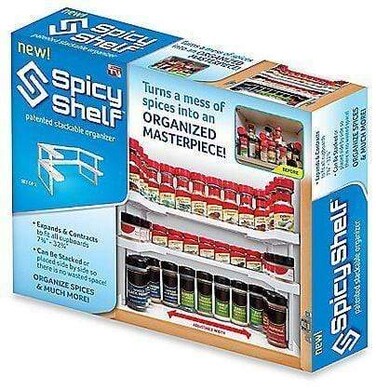 - Description of spicy shelf stackable spice rack organizer holds upto 64 spicesspicy shelf patented stackable organizer organize your spices, medicine and much more with the handy spicy shelf stackable organizer. Adjustable so it can fit into any cabinet, this organizer even includes free-standing legs in case you want to have it be on its own. The spicy shelf stackable organizer easily expands and contracts to fit into any cabinet or nook ideal for keeping you kitchen or bathroom organized and neat free-standing legs included adjustable width stackable acrylic construction