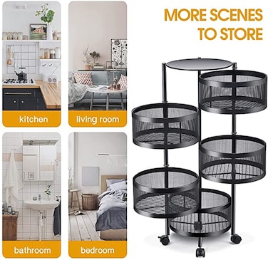 Multi-Layer Kitchen Storage Shelf, Round Steel Rotating with 4 Movable Wheels, Kitchen Storage for Fruit and Vegetable Floor-Standing(5F Black)