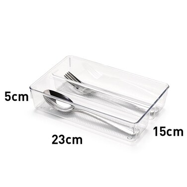Rectangular with 2 separate compartments: 15 x 23 x 5cm This plastic kitchen drawer organizer / cutlery tray can be used for kitchen drawers or any drawer that needs some organization. It comes in many different sizes and