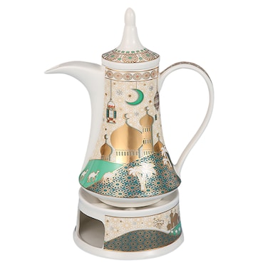Ramadan Design Arabic Coffee Pot ceramic, Healthy and Extremely Heat Resistant with Candle Warmer, with ramadan design ,gold and green color(L-30*W-7*H-15.5 CM)