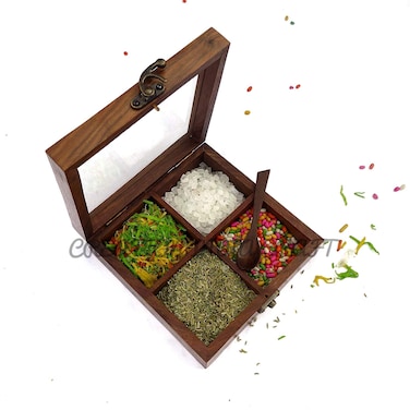 Star Cook India Craft Wooden Hexagonal Spice Box Masala Dabba Containers Jars Set for Kitchen with Spoon in Rosewood for Kitchen Masala Box 7 Non Detachable Compartments 100 ML Brown