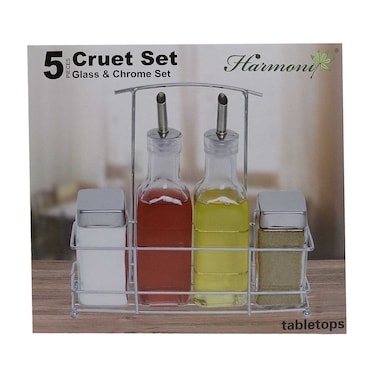 The Harmony Table Top Cruet Set Clear 5 PCS is a stylish and practical addition to any dining table.