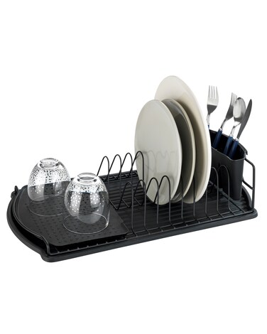 The Wenko Basic Dish Rack is suitable for kitchens of all shapes and sizes and does an excellent job of storing and organizing the dishes properly. Its unique shape with different compartments and segments make it the perfect kitchen helper as you can store cutlery, plates, glasses, crockery, and more on the dish rack. The rack is made from high-quality, premium materials that will last a long time and won't catch rust that easily. The trendy black finish of the rack makes it stand out in the kitchen and is a cool conversation starter. There is a separate segment or tray below the dish rack that is perfect for collecting any residue water dripping from the dishes. Instead of cleaning out water stains, you can just remove the drip tray and throw away the water to keep the surface and your dishes clean and dry. You can even remove and use the drip mat separately if there isn'tisn't much space for the entire rack beside the sink. One of the best things about this rack is its size, and although it is great for bigger kitchens and families, it fits in perfectly in smaller kitchens as well. It has space for bowls, cups and glasses; it contains a removable cutlery basket where you can place all your spoons, knives, and fork. There is also a plate holder for, well, holding plates and keeping them dry for a long time.