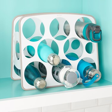 - The BottleStand stores eight bottles – horizontally or vertically – wherever you need them. There's extra space to fit mug handles and straws too. Having an organized collection helps you make a quick choice and move on with your (hydrated) day. • Holds 8 water bottles or travel mugs up to 3.5" wide • Stores bottles horizontally (cabinet) or vertically (drawer) for best fit • Stays in place with non-slip border • Durable, BPA-free plastic provides safe storage • Snaps together in one minute or less, no tools required • Color: White