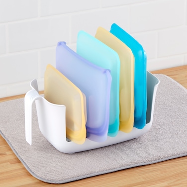 Dry+Store Bag Drying Rack provides a simple solution for drying and storing reusable food bags and plastic baggies. The drying rack is designed with wide prongs that keep any size food bags open to quickly air-dry inside and out. To use, simply place washed silicone bags over the prongs so bags stay open to air-dry. When bags are dry, just toss them inside the bin and store the rack in the cabinet. This kitchen organizer is an easy, eco-friendly win. With the right drying rack, you can use (and reuse) your food storage bags!