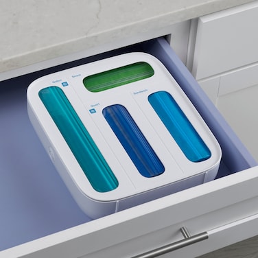 StoraBag™ Food Bag Dispenser keeps all your food storage bags in one tidy organizer. Individual compartments hold standard size plastic bags in any drawer or cabinet while reducing box clutter. Bright, removable labels let you see what you have and find the baggie size you need. It’s easy to pull a bag from the wide slots and a removable lid helps you reload quick. With supplies organized in a drawer dispenser, meal prep is in the bag.
