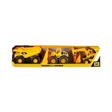 The CAT Mini Crew Construction Vehicle Set in Yellow includes three mini construction vehicles: a dump truck, a bulldozer, and a wheel loader.