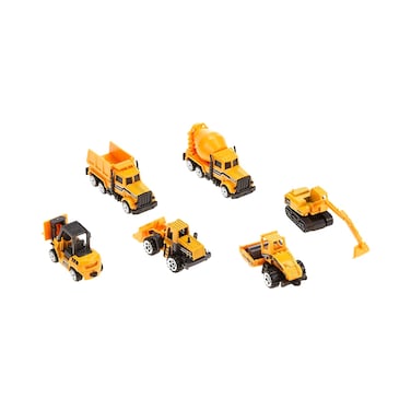 The Power Joy Vroom Vroom 6-in-1 Diecast Premium Construction Car 86514 is a set of 6 yellow construction cars.