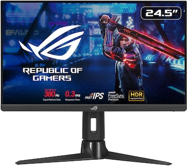 - <p><li>24.5-inch FHD (1920 x 1080) fast IPS gaming monitor with 380 Hz (OC) refresh rate designed for professional esports gamers <p><li>ASUS Fast IPS technology enables a 0.3 ms response time (min.) for sharp gaming visuals with high frame rates <p><li>ASUS Extreme Low Motion Blur Sync (ELMB SYNC) technology enables ELMB together with variable refresh rate, eliminating ghosting and tearing for sharp gaming visuals with high frame rates <p><li>High Dynamic Range (HDR) technology with professional color gamut delivers contrast and color performance that meets the DisplayHDR™ 400 certification <p><li>FreeSync Premium technology delivering a seamless, tear-free gaming experience