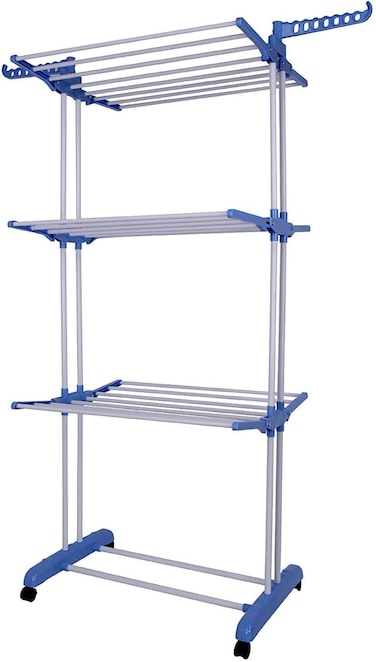 Generic Indoor Foldable Powder Coated 3 Layer Tier Clothes Folding Dryer Stand Rack With Wheels (Blue)